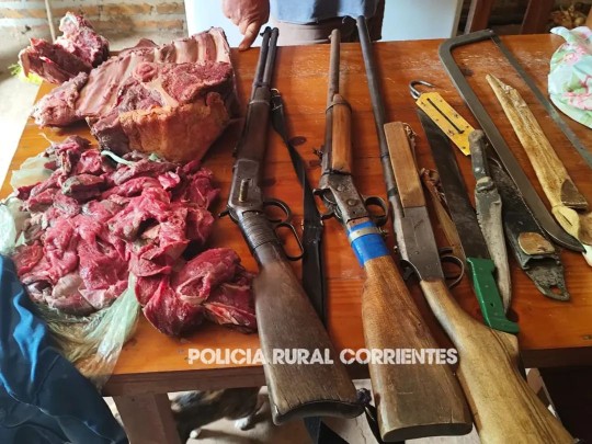 En el domicilio, perteneciente a Ramón Francisco I., conocido como “Quiquila”, los efectivos hallaron restos de carne vacuna (costilla, pulpa y espinazo), un cuero completo de pelaje colorado pampa, además de cuchillos, un serrucho de carnicero y una balanza de resorte, elementos que indicarían la faena reciente de animales.